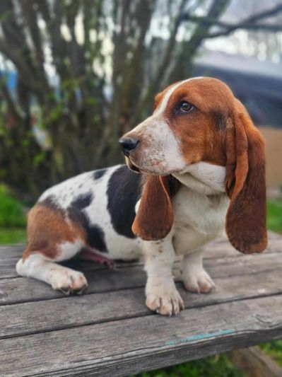 Siren Song (we call her Ryn for short) was also born in Plummer Idaho on April 7th, 2022. After our amazing experience with Feyre and the program she came from, we decided to go back to get another basset hound puppy from the same program. Ryn was an adorable puppy, her ears were bigger than her head and she was the runt of the litter! She was the smallest basset hound puppy I had ever seen! She grew quickly and has grown into a beautiful girl. Ryn has a special trait, she is our tri color blue dilute carrier. Ryn carries one copy of the blue dilute gene. Because of this, she can produce both dilute (blue) coat puppies and standard coat puppies as well. Ryn is a beautiful example of the American Basset Hound. Ryn is small in stature and lean, making her agile and less likely to develop the health issues of the heavier stature of European Basset Hounds. Ryn has allot of energy and would be wonderful for hunting or agility training.